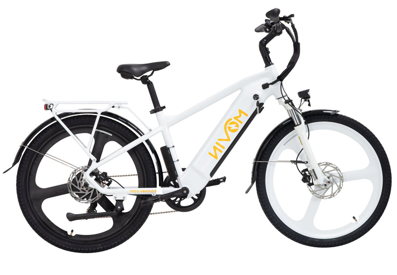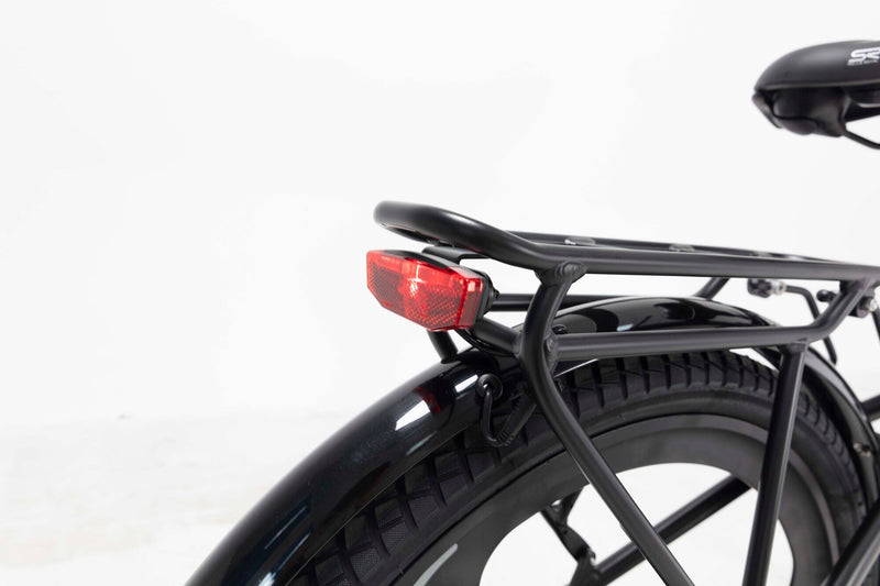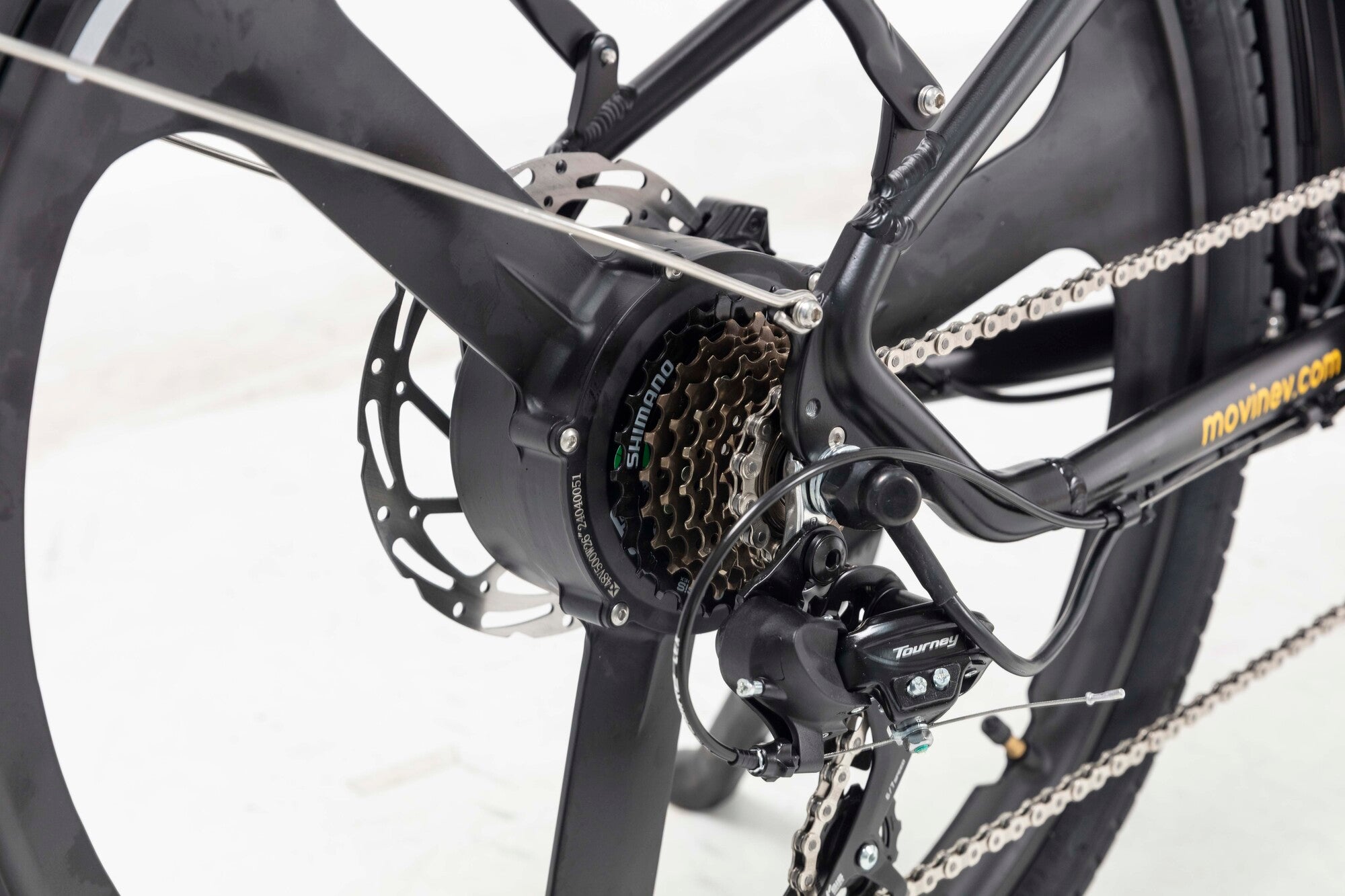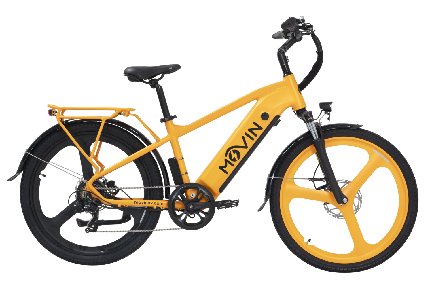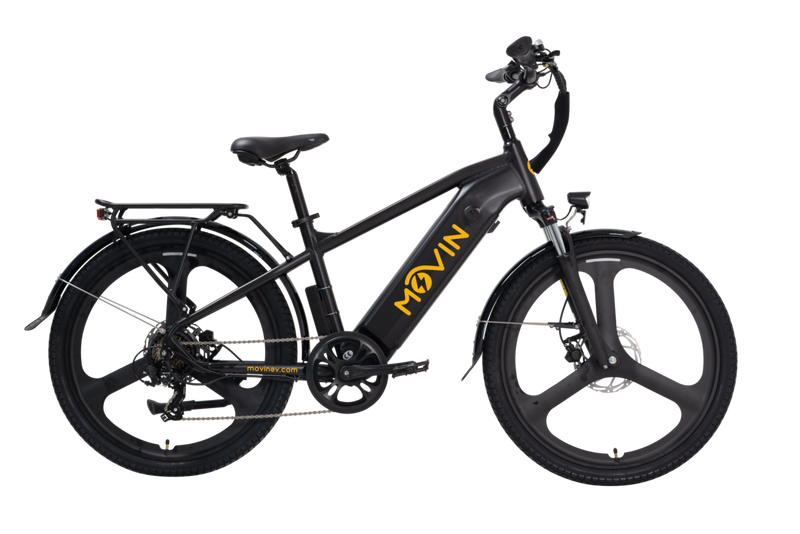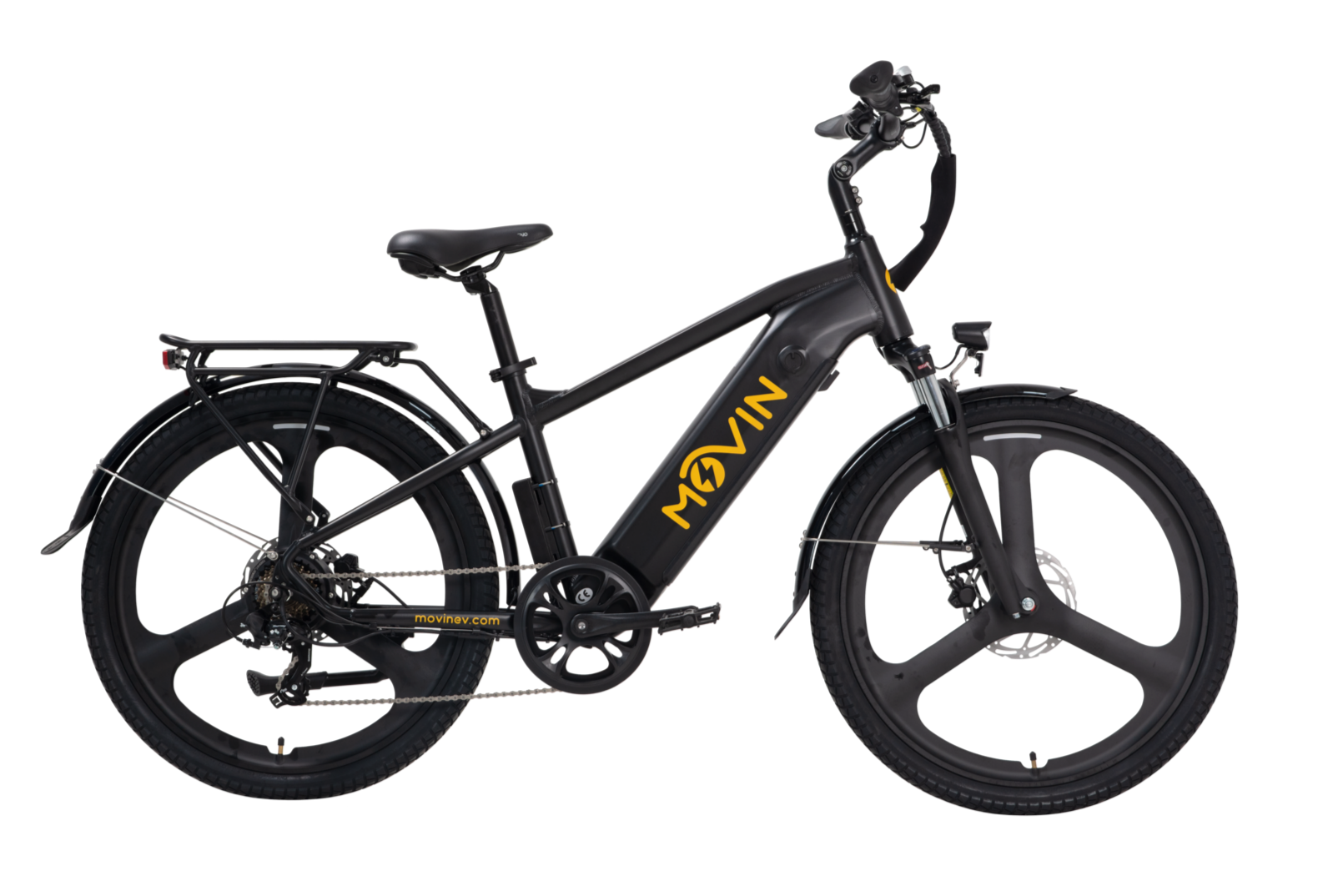 Movin' Tempo Max Electric Bike - Maximum Speed 20mph (32km/h). Extended range urban e-bike combining reliability and power for longer rides. Samsung 48V 20Ah battery (960Wh) and 500W hub motor deliver up to 90km per charge. Aluminum frame with adjustable front fork and CST 26×2.1″ tires provide strength and traction on any terrain. Tektro HD E3520 hydraulic disc brakes and Shimano Tourney 7-speed drivetrain with KMC chain ensure precision control. LED display with charge, assist, and error indicators plus 30 lux LED lights for safety. Water-resistant wiring, walking mode, and fast 48V 3A charger included. Built-in rack, mudguards, and Selle Royal Essenza Plus gel saddle for comfort. Ideal for extended urban commutes and off-road adventures.